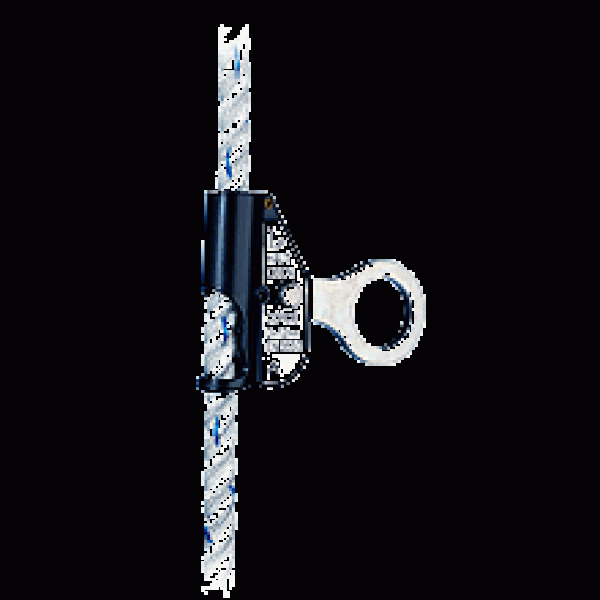 Urządzenie samozaciskowe ze znacznikiem upadku, zamocowane na stałe na linie skręcanej 12 mm.