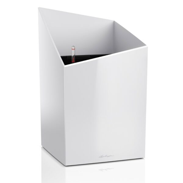 W skład kompletu wchodzi donica, wkład wewnętrzny, zestaw nawadniający oraz substrat Lechuza PON.