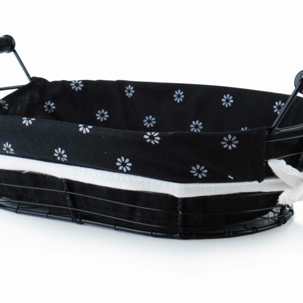 Podczas wielu rodzinnych obiadów czy spotkań z bliskimi na stole chcemy podać chleb. Dobrym rozwiązaniem, będzie przygotowanie mniejszych kromek chleba i ułożenie ich w eleganckim, czarnym koszyku od firmy Mondex. Koszyk wykonany został z metalu odpornego na wygięcia i uszkodzenia. Wnętrze koszyka wyścielone jest czarnym materiałem w drobne kwiaty, który możemy zdjąć do prania. Wykończeniem materiału jest lamówka, którą przy uchwytach możemy zawiązać w kokardkę. Bez wątpienia, podany w ten sposób chleb będzie ładnie prezentował się na stole, a sam koszyk doda elegancji i szyku podczas spotkania z rodziną i przyjaciółmi.