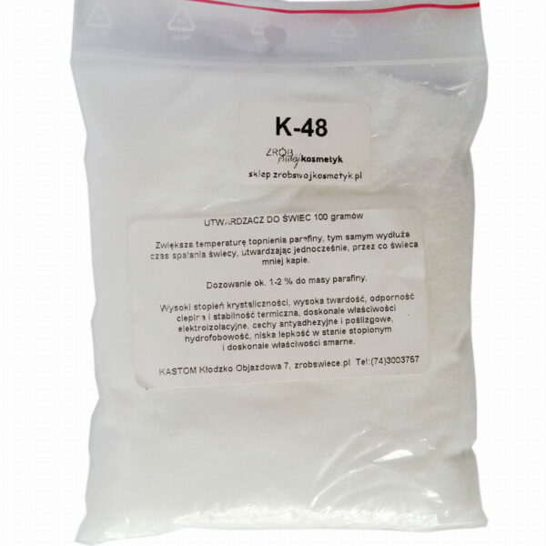 Barwa biała granulat. Utwardzacz stosuje się jako dodatek do parafiny, świec ponieważ: Zwiększa temperaturę topnienia parafiny (świec) tym samym wydłuża czas spalania świecy, utwardzając ją jednocześnie, przez co świeca mniej kapie. Większość świec najwyższej jakości od czołowych producentów zawiera w sobie utwardzacz. UTWARDZACZ dozuję się do parafiny w proporcji: 1-2 % do masy parafiny/stearyny.