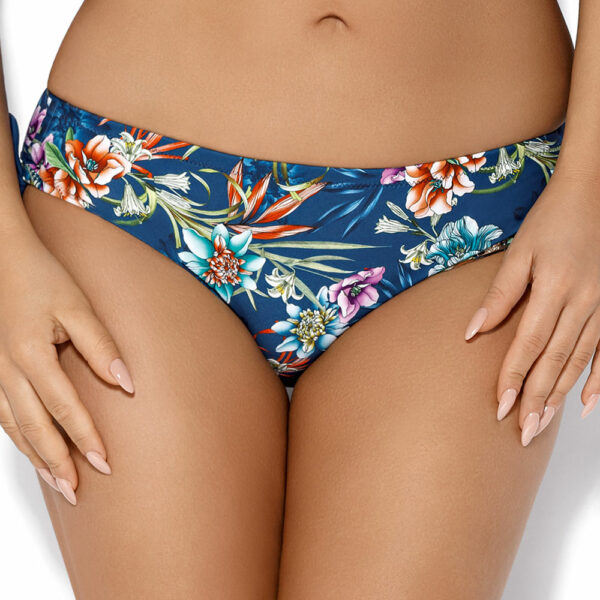 Figi kąpielowe w egzotyczny, kwiatowy wzór, które świetnie podkreślają opaleniznę. Figi o klasycznym kroju. Tył wykonany jest z niebieskiej dzianiny. Po bokach troczki, dzięki którym można regulować szerokość boczków.