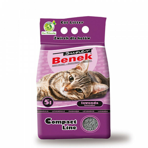 Super Benek COMPACT LAWENDAŻwirek ten zawiera kompozycję lawendy o przyjemnym i uspokajającym zapachu. Olejki lawendy mają ponadto różnorakie zastosowanie, m.in. działają aseptycznie oraz likwidują napięcia nerwowe. Polecany szczególnie dla zwierząt młodych, bardzo ruchliwych, często przebywających na zewnątrz. Żwirki higieniczne Compact charakteryzują się drobnym uziarnieniem (0,5-2 mm). Precyzyjnie dobrana frakcja oraz zastosowana technologia produkcji zapewniają doskonałą wydajność żwirków. Wyroby bardzo dobrze się zbryla tworząc foremne, małe i płaskie grudki. Wysoka chłonność umożliwia długą eksploatację produktu.Opakowanie 5L