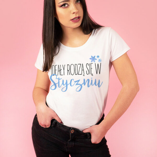 Koszulka w kolorze czystej bieli z nadrukiem wykonanym metodą cyfrową.