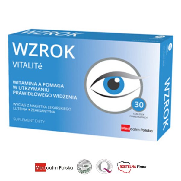 VITALITÉ WZROK Preparat Vitalite Wzrok jest suplementem diety, przeznaczonym dla osób dorosłych, w szczególności pracujących przy komputerze i odczuwających zmęczenie oczu. Stanowi połączenie zeaksantyny z wyciągiem z kwiatów nagietka – naturalnego źródła luteiny. Zawarta w preparacie witamina A pomaga w utrzymaniu prawidłowego widzenia. Tabletki powlekane, 30 tabl. (1 x 30 szt.)OpisPreparat przeznaczony jest dla osób dorosłych.SkładnikiWyciąg z kwiatów nagietka lekarskiego (Calendulae flos) – źródło luteiny i zeaksantyny, witamina A.DzialaniePreparat Vitalite Wzrok jest suplementem diety, przeznaczonym dla osób dorosłych, w szczególności pracującychprzy komputerze i odczuwających zmęczenie oczu. Stanowi połączenie zeaksantyny z wyciągiem z kwiatów nagietka –naturalnego źródła luteiny. Zawarta w preparacie witamina A pomaga w utrzymaniu prawidłowego widzenia.Dawkowanie2 tabletki dziennie, w trakcie posiłku, popijając wodą. Zawartość w zalecanej porcji dziennej – 2 tabletkiWyciąg z kwiatów nagietka, w tym: 140 mgLuteina 28 mgZeaksantyna 5,6 mgWitamina A 0,25 ug 31% RWS** % realizacji referencyjnej wartości spożyciaNie należy przekraczać zalecanej porcji do spożycia w ciągu dnia. Preparat nie może być stosowany jako substytutzróżnicowanej diety. Prowadzenie zdrowego trybu życia i stosowanie zróżnicowanej diety są niezbędne dlazachowania dobrego stanu zdrowia.Ważna informacjaNie stosować preparatu w przypadku uczulenia na którykolwiek z jego składników.