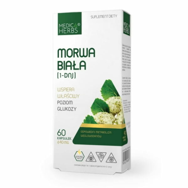 Morwa biała (1-DNJ) 1% 1-deoksynojirimycyny (1-DNJ) Morwa biała (Morus alba) dzięki zawartości 1-deoksynojirimycyny wspiera prawidłowy metabolizm węglowodanów, przez co sprzyja utrzymaniu właściwego poziomu cukru we krwi. Ponadto jest stosowana wspomagająco w schorzeniach układu krążenia i miażdżycy. Składniki: (w przeliczeniu na zalecaną porcję do spożycia w ciągu dnia – 1 kapsułka): wyciąg z liści Morus alba 640 mg (6,4 mg 1-DNJ); żelatyna (kapsułka). Produkt nie zawiera żadnych sztucznych dodatków takich jak konserwanty, barwniki, aromaty, wypełniacze. Odcień produktu może się różnić ze względu na intensywność koloru naturalnego składnika. Zawartość: 60 kapsułek. Kategoria: Poziom cukru Dodatkowe informacje Dawkowanie: 1 kapsułka raz dziennie minimum 15 minut przed posiłkiem. Uwagi: U osób stosujących terapię insulinową lub doustne leki hipoglikemizujące stosować po konsultacji z lekarzem.Nie stosować u kobiet w ciąży oraz karmiących piersią. Nie przekraczać zalecanej porcji do spożycia w ciągu dnia. Nie stosować w przypadku uczulenia na którykolwiek ze składników produktu. Suplement diety nie może być stosowany jako substytut (zamiennik) zróżnicowanej diety. Zalecany jest zbilansowany sposób żywienia oraz zdrowy tryb życia.Przechowywać w temperaturze pokojowej w suchym miejscu niedostępnym dla małych dzieci. Chronić przed wilgocią i światłem.