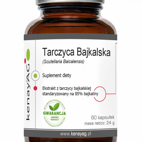 Tarczyca Bajkalska (Scutellaria Baicalensis) (60 kapsułek) - suplement diety Składniki: ekstrakt z tarczycy bajkalskiej (Scutellaria Baicalensis) standaryzowany na zawartość bajkaliny: 85%, kapsułka: hydroksypropylometyloceluloza. Porcja dzienna: 2 kapsułki Opakowanie zawiera: 60 kapsułek Skład w porcji dziennej (2 kapsułki) Ekstrakt z tarczycy bajkalskiej (Scutellaria Baicalensis) (korzeń), w tym: - bajkalina: 85% 800 mg 680 mg Ekstrakt z tarczycy bajkalskiej standaryzowany na 85% bajkaliny Bajkalina - działa jako naturalny przeciwutleniacz, pomaga zmniejszyć stres oksydacyjny spowodowany uszkodzeniem kolagenu. Utrzymuje elastyczność stawów i chroni ścięgna. Przyczynia się do prawidłowego funkcjonowania mięśni szkieletowych podczas normalnej aktywności fizycznej. Sposób użycia: 2 razy dziennie po jednej kapsułce Sposób przechowywania: przechowywać w zamkniętym opakowaniu w temperaturze pokojowej, w sposób niedostępny dla małych dzieci Uwagi: nie należy przekraczać zalecanej porcji do spożycia w ciągu dnia. Suplementy diety nie mogą być stosowane jako substytut (zamiennik) zróżnicowanej diety. Należy prowadzić zdrowy tryb życia i prawidłowo się odżywiać. Nie należy stosować w przypadku nadwrażliwości na jakikolwiek składnik preparatu. Preparatu nie powinny stosować kobiety w ciąży, karmiące piersią oraz dzieci i młodzież poniżej 18 roku życia. Producent/Dystrybutor: Kenay Sp. J.