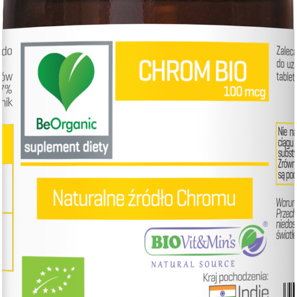 Chrom BIO 100 mcg x 100 tabletek Chrom: pomaga w utrzymaniu prawidłowego poziomu glukozy we krwi przyczynia się do utrzymania prawidłowego metabolizmu makroskładników odżywczych Składniki: mieszanina ekologicznych ekstraktów z pietruszki (Petroselinum crispum) i z liści curry (Bergera koenigii), substancja wypełniająca: ekologiczny błonnik akacjowy. Składniki 1 tabletka 2 tabletki Ekologiczne ekstrakty z pietruszki i z liści curry 7 mg 14 mg w tym chrom 100 mcg (250% RWS)* 200 mcg (500% RWS)* *RWS – dzienna Referencyjna Wartość Spożycia dla przeciętnej osoby dorosłej Zalecana porcja do spożycia w ciągu dnia niezbędna do uzyskania korzystnego działania produktu: 1-2 tabletki w trakcie lub po posiłku popijając wodą. Nie należy przekraczać zalecanej porcji do spożycia w ciągu dnia. Produkt nie może być stosowany jako substytut (zamiennik) zróżnicowanej diety. Zrównoważony sposób żywienia oraz zdrowy tryb życia są podstawą prawidłowego funkcjonowania organizmu. BeOrganic BIOVit&Min’s to suplementy diety będące źródłem naturalnych witamin i minerałów, w postaci ekologicznych ekstraktów roślinnych, standaryzowanych na zawartość odpowiednich składników odżywczych. BeOrganic Chrom BIO to wysoka dawka 100 µg naturalnego chromu, w postaci mieszanki ekologicznych ekstraktów BIOVit&Min’s z pietruszki (Petroselinum crispum) i z liści curry (Bergera koenigii). Ekstrakt BIOVit&Min’s spełnia wysokie standardy żywności ekologicznej. W procesie ekstrakcji nie są stosowane żadne sztuczne rozpuszczalniki ani chemikalia. Zawarty w produkcie chrom występuje jedynie w biologicznie czynnej i bezpiecznej, trójwartościowej formie – jako dobrze przyswajalne, organiczne kompleksy Cr(III) z aminokwasami i lipidami. Warunki przechowywania: przechowywać w temperaturze pokojowej, w sposób niedostępny dla małych dzieci. Chronić przed wilgocią i światłem.