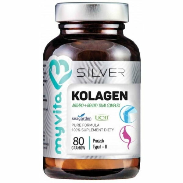 Kolagen Dual (Beauty + Arthro Complex) 80g Myvita Silver Pure Właściowści: Kolagen typu I SeaGarden® to doskonałej jakości kolagen hydrolizowany pozyskiwany z dorsza dziko żyjącego w czystych wodach północnego Atlantyku. Surowiec jest przetwarzany w zaawansowanym procesie, który pozwala na zachowanie wszystkich właściwości biologicznych. Dzięki kolagenowi I typu włosy, skóra i paznokcie zachowują prawidłowy stan. Preparat zawiera natywny opatentowany kolagen typu II UC-II®, opracowany na podstawie badań klinicznych. Jego struktura charakteryzuje się trójwymiarową budową łańcuchów polipeptydowych, co sprawia, że jest wytrzymały na działanie kwasów w żołądku i przechodzi w niezmienionej formie aż do jelit bez strat ilościowych i jakościowych, a następnie transportowany naczyniami krwionośnymi i limfatycznymi bezpośrednio do stawów. Oddziaływanie kolagenu UC-II® potwierdzają liczne badania kliniczne prowadzone przez wyspecjalizowane jednostki. Wyniki dowodzą, że surowiec ten wpływa istotnie na zmniejszenie bólu stawów oraz ich odpowiednią elastyczność i ruchliwość. Składniki: norweski kolagen hydrolizowany z dorsza atlantyckiego (Gadus morhua) SeaGarden® typu I, hydrolizowany kolagen z chrząstki kurczaka typu II, siarczan chondroityny, kwas L-askorbinowy, kolagen natywny UC-II® z chrząstki kurczaka typu II, kwas hialuronowy. Sposób użycia: 2 płaskie łyżeczki dziennie. Wymieszać w wodzie. Dzienna porcja zawiera: Kolagen typu I 2316 mg Kolagen typu II 50 mg Witamina C 80 mg 100% RWS* Chondroityna 10 mg Kolagen typu II UC-II® 3 mg Kwas hialuronowy 1 mg *RWS – referencyjna wartość spożycia Nie należy przekraczać zalecanej dziennej porcji do spożycia. Suplementy diety nie mogą być stosowane jako substytut (zamiennik) zróżnicowanej diety. Nie zaleca się kobietom w ciąży, karmiącym piersią oraz dzieciom. Przechowywać w temperaturze pokojowej, w sposób niedostępny dla małych dzieci. Dla utrzymania prawidłowego stanu zdrowia należy stosować zróżnicowaną dietę i prowadzić zdrowy styl życia. Opakowanie: 80 gramów