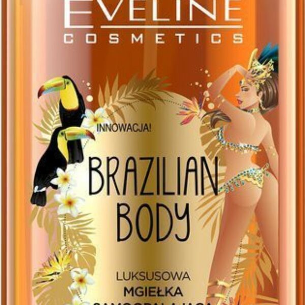 EVELINE Brazilian Body Luksusowa mgiełka samoopalająca do twarzy i ciała 5w1:nadaje efekt ładnej opalenizny, pozbawionej przebarwień oraz smug, efekt utrzymuje się do 7 dni, przy regularnym stosowaniu mgiełki można delikatnie przyciemnić koloryt swojej cery, zawiera ekstrakty roślinne - olejek rzepakowy, guaranę, olejek z różowy pieprz,nawilża, regeneruje i odżywia, posiada aksamitną konsystencje, szybko się wchłania.