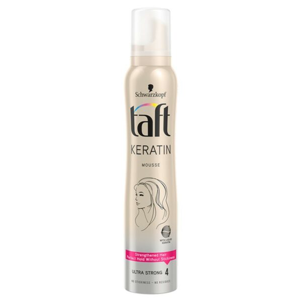 100% Wzmocnione włosy - supermocna pianka do włosów. Formuła Taft Keratin z płynnymi elementami keratyny, identycznymi jak w strukturze włosa, wzmacnia włosy!Dla 48h utrwalenia bez sklejania i bez śladów na włosach. Pomaga chronić włosy przed wysuszeniem i nie obciąża ich. Specjalna wzmacniająca formuła wzmacnia włosy i pomaga chronić je przed promieniowaniem UV.