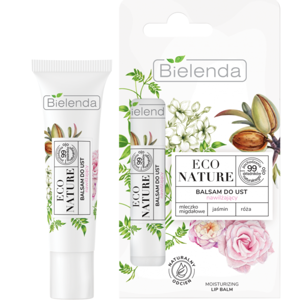 Bielenda Eco Nature balsam do ust nawilżający:nawilża, zmiękcza i wygładza, mleczko migdałowe posiada właściwości odżywiające, nawilżające i zmiękczające, jaśmin koi, łagodzi przynosząc ulgę przesuszonym ustom, róża idealnie wygładza, nawilża i odżywia naskórek, nie pozostawia uczucia lepkości na ustach, pojemność 10g. Sposób użycia: Balsam rozprowadź równomiernie na ustach, stosuj wg potrzeb. Produkt do całorocznej pielęgnacji.Produkt zawiera w 99% składników pochodzenia naturalnego. Kosmetyk wegański. #crueltyfree #ecofriendly