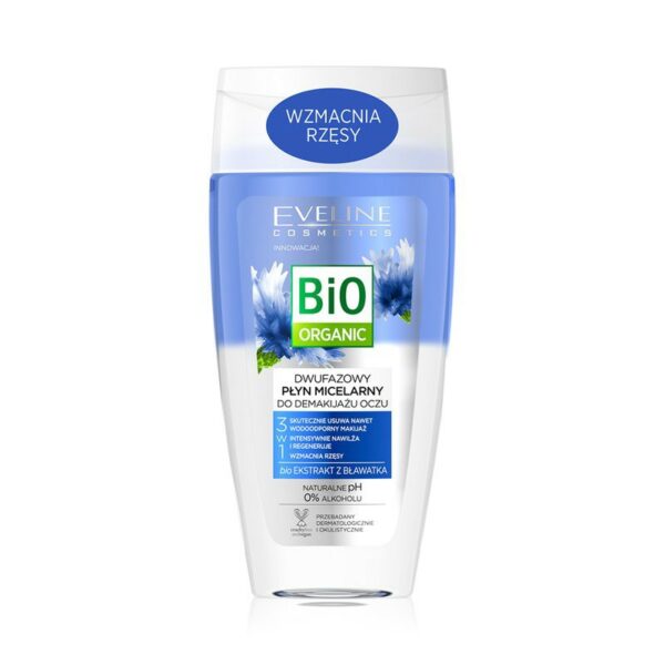 Eveline Bio Organic Dwufazowy płyn micelarny do demakijażu oczu:świetnie zmywa nawet najbardziej trwały i wodoodporny makijaż, pozostawia cerę nawilżoną, odżywioną, nie pozostawia tłustej warstwy,wzmacnia i regeneruje rzęsy, nie zawiera alkoholu i posiada naturalne pH,Bioekstrakt z bławatka, lotosu, świetlika lekarskiego i wody kokosowej redukuje oznaki zmęczenia, pielęgnuje skórę wokół oczu i wzmacnia rzęsy. Zapobiega przesuszeniom oraz odżywia.Produkt został przebadany dermatologicznie i okulistycznie,pojemność 150ml. Sposób użycia: Wstrząsnąć przed użyciem, następnie nałożyć zwilżyć wacik płynem i oczyścić okolice oczu. Przy bardziej trwałym makijażu przytrzymać wacik na powiece kilka sekund. Zmyć makijaż.Produkt wegański.