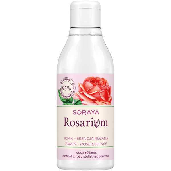 Soraya Rosarium Tonik-esencja różana 200ml:formuła toniku, która przywraca skórze równowagę pH, nawilża skórę oraz nie pozostawia na skórze uczucie dyskomfortu, posiada naturalny zapach wody różanej,Woda różana i ekstrakt z róży stulistnej – nawilżają i koją skórę, zapewniają jej gładkość,Pantenol – działa nawilżająco i łagodząco,95% składników pochodzenia naturalnegoSposób użycia: Nasącz tonikiem płatek kosmetyczny, przetrzyj twarz, następnie nałóż ulubiony krem lub serum ROSARIUM.