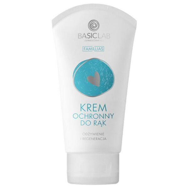 BasicLab Famillias Hand Cream Krem Ochronny Do Rąk Odżywienie I RegeneracjaBasicLab - Famillias - Ochronny krem do rąk - lipidowy krem ochronny do rąk, który skutecznie odżywia i regeneruje suche, szorstkie dłonie. Zawiera opatentowany kompleks Biolin P, który odnawia florę bakteryjną skóry, dzięki czemu jest ona bardziej odporna na działanie szkodliwych czynników zewnętrznych. Bogata formuła zawiera aż siedem olejów: z oliwek, lniany, macadamia, kokosowy, słonecznikowy, arganowy i z awokado, które tworzą barierę ochronną na powierzchni skóry, odżywiają i zmiękczają naskórek. Trehaloza zatrzymuje wodę w naskórku, a pantenol i inulina nawilżają, łagodzą podrażnienia, zmiękczają i odżywiają skórę. Krem zawiera aż 98% składników pochodzenia naturalnego, szybko się wchłania i nie pozostawia tłustego filmu. Tuba pochodzi z recyklingu.Produkt zawiera: Biolin P - chroni skórę przed działaniem czynników zewnętrznych,siedem olejów - odżywiają i zmiękczają oraz tworzą barierę ochronną na powierzchni skóry,pantenol - nawilża, zmiękcza i odżywia,trehaloza - disacharyd z alg morskich, przeciwutleniacz, zatrzymuje wodę w naskórku,inulina - nawilża, działa łagodząco.Działanie produktu:nawilża,odżywia,chroni,zmiękcza.Rodzaje skór oraz defekty kosmetyczne, dla których ten produkt może być pomocny: suche, szorstkie dłonie. Sposób aplikacji: Nałóż na dłonie i rozsmaruj. Stosuj tak często, jak tego potrzebujesz. Pojemność: 75ML