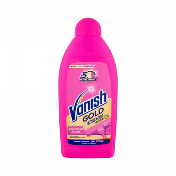 Vanish Gold Płyn Do Prania Dywanów LemonVanish Gold Carpet Care to skuteczny i wydajny płyn do ręcznego mycia dywanów. Usuwa najbardziej uporczywe zabrudzenia, wnikając bardzo głęboko we włókna i nadając Twoim dywanom zupełnie nowy blask i świeżość.Usuwa aż 5 razy więcej brudu niż samo odkurzanieNajmocniejsza Wersja: Goldneutralizuje nieprzyjemny zapachnadaje świeżościwyjątkowo zmiękczado Prania RęcznegoDodatkowo wielkim atutem jest jego świeży cytrynowy zapach!Sposób użycia:Odkurz czyszczoną powierzchnięDodaj do ciepłej wody (40°C) 1 miarkę szamponu na 9 miarek wody.Rozprowadź równomiernie pianę po dywanie (nie przemocz)Pozostaw do wyschnięciaPo wyschnięciu ponownie odkurz powierzchnięGOTOWE !Pojemność: 500ML