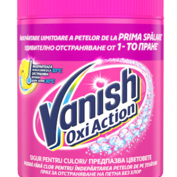 Vanish Oxi Action Odplamiacz Do KoloruNowa formuła odplamiacza Vanish Oxi Action Pink zwalcza wszystkie rodzaje plam - od tych najbardziej rzucających się w oczy, po te niemal niewidoczne. Vanish usuwa tłuste plamy, plamy z wina, plamy z potu, plamy z czekolady, plamy z herbaty, plamy z kawy, plamy z trawy, plamy z krwi, plamy z błota oraz zaschnięte plamy. Zero plam już po pierwszym praniu - za każdym razem!Zalety produktu:niezawodne usuwanie plamdziała nawet w zimnej wodziezwalcza najbardziej uporczywe plamydziała w krótkich cyklach pranianie niszczy tkanindo białych i kolorowych tkaninbez chloruJak stosować proszek Vanish na plamy?Pocieranie:Wymieszaj 1/4 miarki proszku z 3/4 miarki wody, dobrze wymieszajNałóż mieszankę na całą powierzchnię plamyUżyj dolnej części miarki do rozprowadzenia mieszanki po powierzchni plamy. Pozostaw na plamie maksymalnie do 5 minutUpierz jak zwykle