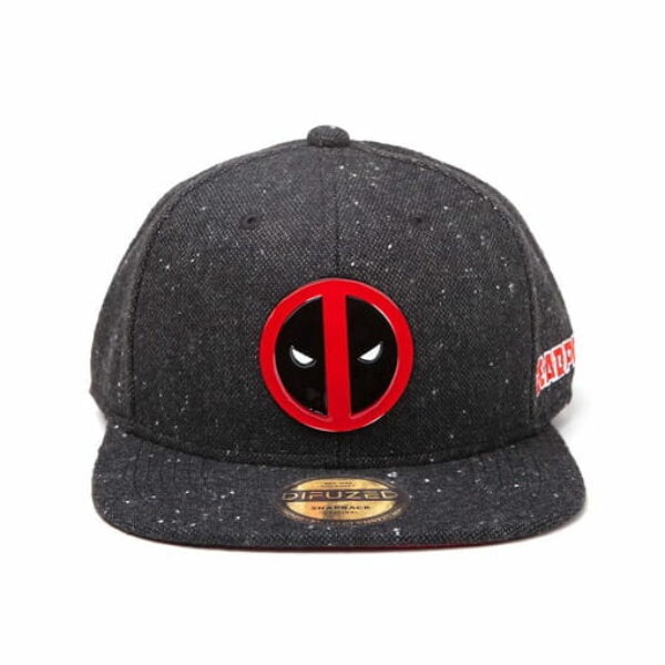 Czapka typu Snapback z metalowym logo Deadpoola na froncie będzie idealnym dodatkiem do twojej garderoby Materiał: 80% poliester, 20% bawełna Wymiar: 25 x 18 x 10 cm Rozmiar regulowany od 55 do 64 cm Prać wyłącznie ręcznie Zawiera odblaskową naklejkę Difuzed™ Oficjalny produkt na licencji Marvel™, wykonany przez Difuzed™