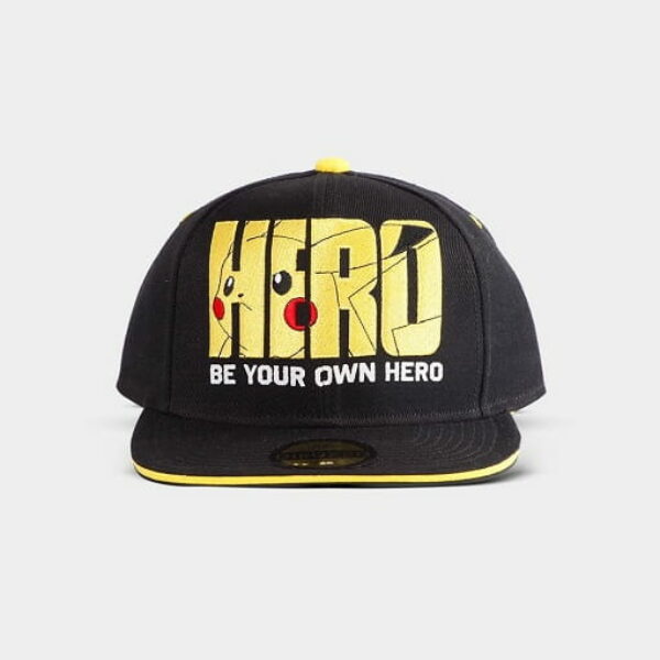 Czapka typu Snapback z wyszywanym napisem Hero oraz Pikachu na froncie i napisem Pikachu w języku japońskim z tyłu będzie idealnym dodatkiem do twojej garderoby Materiał: 85% poliakryl, 15% bawełna Wymiar: 25 x 18 x 10 cm Rozmiar regulowany od 55 do 64 cm Prać wyłącznie ręcznie Zawiera odblaskową naklejkę Difuzed™ Oficjalny produkt na licencji Nintendo™, wykonany przez Difuzed™