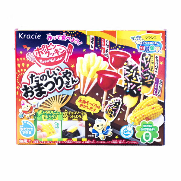 Kracie Cookin Matsuri to idealny produkt dla osób chcących poznać najbardziej oryginalne przekąski. Prosty w przygotowaniu zestaw jak na japońskim festiwalu czyli banan w czekoladzie, kukurydza, jabłko na patyku oraz frytki. Zestaw do samodzielnego przygotowania Nie zawierają sztucznych konserwantów i barwników Przechowywać w suchym i chłodnym miejscu Skład: cukier, glukoza, olej roślinny: kukurydziany, skrobia, dekstryna, laktoza (mleko), kakao w proszku 5%, białka z mleka (mleko), żelatyna, jogurt (mleko), skrobia modyfikowana, barwnik (karmel, karoteny), gardenia, szafran, regulator kwasowości: węglan wapnia, aromaty, substancja zagęszczająca: alginian sodu, emulgator: lecytyny (soja), substancja wiążąca: fosforany wapnia, substancja spulchniająca: difosforany.