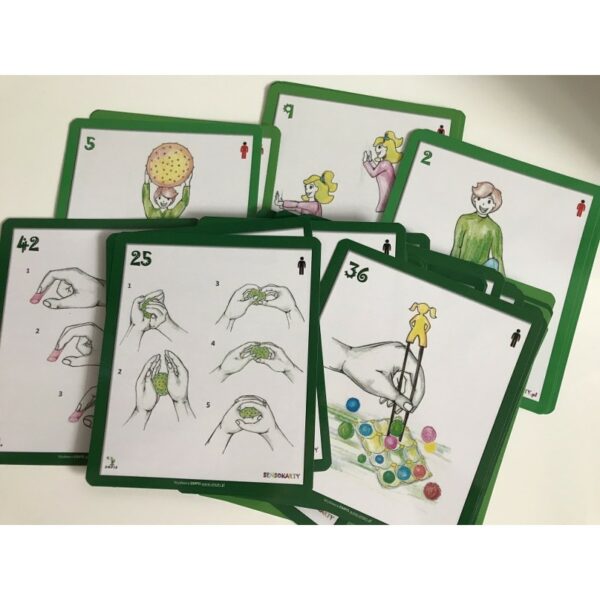 SENSOKARTY to zestaw kilkudziesięciu kart (z ćwiczeniami), wzbogaconych kolorowymi ilustracjami oraz opisami, które mają pomóc terapeutom w stworzeniu i poprowadzeniu prawidłowej diety sensorycznej, a także urozmaicić terapię. W każdej talii (oddzielnej dla poszczególnych systemów sensorycznych) znajduje się około 20 kart z ćwiczeniami. Na jednej stronie znajdziemy rysunek ćwiczenia, a na drugiej jego dokładny opis podzielony na trzy sekcje. Pierwsza z nich (Cele) informuje o korzyściach terapeutycznych, jakie możemy osiągnąć. Druga (Wskazówki) zawiera informacje dla terapeuty, podpowiedzi dotyczące kontroli wykonania ćwiczenia lub propozycje modyfikacji zadania. Ostatnia sekcja (Ćwiczenie) to zalecenia dla dziecka, jak „krok po kroku" wykonać ćwiczenie.Dieta sensoryczna to zestaw indywidualnych, szczegółowo dobranych, codziennych aktywności sensorycznych, które dostarczą do układu nerwowego właściwych bodźców sensorycznych. Wzbogacona o modyfikację środowiska, pomaga dziecku osiągnąć optymalny poziom pobudzenia, polepszyć koncentrację i organizację dnia. Nadrzędnym celem diety sensorycznej jest samoregulacja, czyli samodzielne dostosowanie poziomu pobudzenia do codziennych zadań. Ćwiczenia diety sensorycznej są potężnym narzędziem, ponieważ dziecko aktywnie w nich uczestniczy, jest po nich lepiej skoncentrowane oraz sprawniej potrafi poradzić sobie z codziennymi wyzwaniami.Dieta sensoryczna jest niezbędnym elementem terapii integracji sensorycznej, wykorzystuje się ją we wszystkich typach dysfunkcji. Może być stosowana w przypadku małych dzieci, nastolatków, jak również osób dorosłych. Po włączeniu do codziennych aktywności, powinna być regularnie wykonywana i modyfikowana.WAŻNE!Niezbędnym warunkiem stworzenia prawidłowej, dopasowanej do sensorycznych potrzeb dziecka diety jest ocena procesów integracji sensorycznej przez wykwalifikowanego terapeutę integracji sensorycznej. Nie ma dwóch identycznych diet sensorycznych. Rekomenduje się używanie tych kart tylko pod nadzorem wykwalifikowanego terapeuty integracji sensorycznej.Terapia ręki. Część 4 nie jest stricte elementem diety sensorycznej. Jest zbiorem ćwiczeń, których głównym celem jest usprawnianie tych funkcji percepcyjno–motorycznych, dzięki którym dziecko osiągnie optymalny poziom samoobsługi oraz poprawę sprawności manualnej rąk. Sprawność ta jest bardzo ważna, ponieważ dzięki niej dziecko może bez większych problemów wykonywać zadania wymagające precyzyjnych ruchów dłoni, a prawidłowa sprawność rąk pozwala dziecku być samodzielnym, pisać oraz malować.Musimy pamiętać, że terapii ręki nigdy nie zaczynamy od rysowania szlaczków – to etap końcowy, którego nie obejmują już nasze ćwiczenia.Terapia ręki jest wskazana dla dzieci, które wykazują:- trudności z planowaniem motorycznym oraz uczeniem się nowych czynności manualnych- obniżony poziomem graficzny pisma- problemy z nauką samoobsługi (ubieranie się, mycie zębów, korzystanie z toalety)- trudności w dostosowaniu siły do wykonywanego zadania ruchowego- niechętnie wykonują czynności precyzyjne takie jak pisanie, rysowanie, malowanie, mają trudności w posługiwaniu się prostymi narzędziami- czynności manipulacyjne wykonują wolno, nieprecyzyjnie- trudności w koordynacji ruchów rąk, dłoni i palców, problemy z napięciem mięśniowym- trudności z obustronną koordynacją ruchową i koordynacją wzrokowo-ruchową- dzieci ze wzmożoną wrażliwością na bodźce pochodzące z systemu czucia powierzchniowegoProponowane ćwiczenia (46 kart) zostały podzielone na trzy „podrozdziały"dotyczące poszczególnych części ciała: całego ciała (5 kart), obręczy barkowej i ręki (12 kart) oraz dłoni i palców (29 kart). Istotny jest odpowiedni dobór ćwiczeń, ponieważ wykonywanie prawidłowych ruchów manipulacyjnych następuje po osiągnięciu stabilizacji posturalnej (centralnej), stabilizacji obręczy barkowej, kontroli mobilności nadgarstka oraz koordynacji ruchów palców.O autorze:Anna Sieradzka, Neurologopeda, Psycholog, Glottodydaktyk, Terapeuta Integracji Sensorycznej, Terapeuta Johansen â IAS, wykładowca w Wyższej Szkole im. Pawła Włodkowica w PłockuW 2005 roku ukończyła studia na Akademii Pedagogiki Specjalnej im. Marii Grzegorzewskiej w Warszawie na Wydziale Pedagogika Specjalna â kierunek Logopedia, a w 2008 roku studia na Wyższej Szkole Psychologii Społecznej w Warszawie na Wydziale Psychologii.Od 2007 roku prowadzi Studio Terapii Logopedyczno Pedagogicznej, proacuje równiez w Poradni Sensum Mobile w Warszawie prowadzonej przez Zbigniewa Przyrowskiego (jako logopeda i terapeuta integracji sensorycznej).Prowadzi równiez zajęcia na Wyższej Uczelni im. Pawła Włodkowica w Płocku z pedagogiki (m.in. metodyka oddziaływań rewalidacyjnych, diagnoza rozwoju funkcjonowania osób z niepełnosprawnościami, rehabilitacja zawodowa osób niepełnosprawnych).Jest autorką wielu publikacji dotyczących integracji sensorycznej oraz logopedii oraz autorką pomocy dydatkycznych (jak Sensokarty, Paluszkowe patyczki, Filcaki).