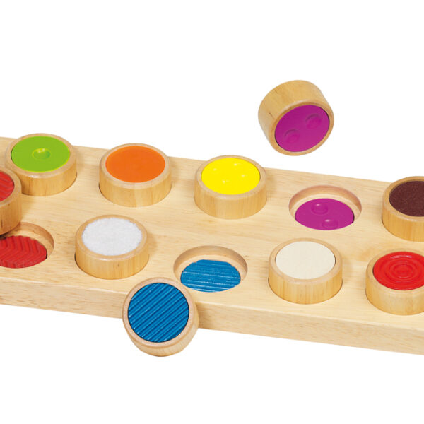 Zadaniem dziecka jest znalezienie par o takiej samej fakturze. W zestawie wykonana z drewna podstawka o wym.: 29 x 13 x 3,5 cm i 10 różnych guziczków.Wiek od: 3 lat
