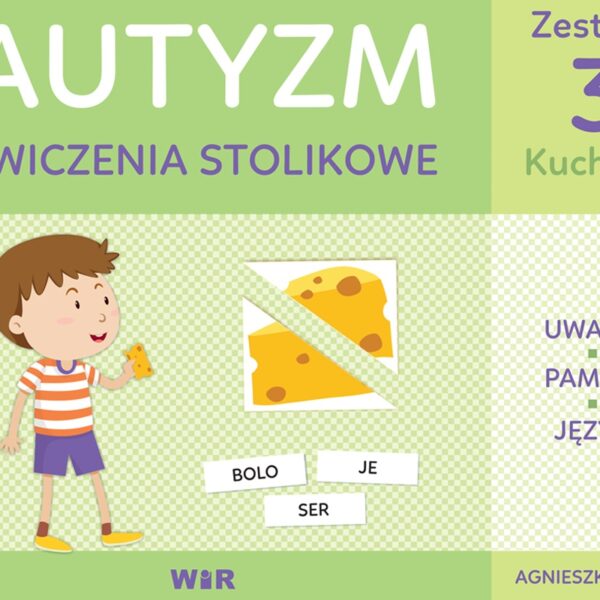 AUTYZM. Ćwiczenia stolikowe. Zestaw 3. Kuchnia, Agnieszka Bala, Wydawnictwo WIR.Zestaw Autyzm. Ćwiczenia stolikowe został zaprojektowany tak, by łączyć pracę terapeuty i zaangażowanie rodziców. Podczas zajęć z terapeutą dziecko nabywa umiejętności, które potem doskonali i utrwala podczas zabawy i codziennej interakcji z rodzicami w domu. Zintegrowane, spójne działanie przynosi najlepsze efekty i pozwala cieszyć się postępami dziecka.Materiał zawarty w teczce charakteryzuje:duży format,spokojna tonacja kolorów,czytelne ilustracje.Dla kogo?Dla dzieci z zaburzeniami ze spektrum autyzmu.Dla dzieci zagrożonych autyzmem.Dla dzieci ze specjalnymi potrzebami edukacyjnymi.Narzędzia metodyczne w zestawie 3:dziennik wydarzeń – pomaga w budowaniu kompetencji komunikacyjnej i językowej,zadania z sylabami – pierwszy zestaw zawierał samogłoski; w drugiej części stopniowo przechodzimy do sylab otwartych.Zawartość zestawu:60 kart ćwiczeń,350 grubych, kartonowych elementów:a) układanki,b) obrazki,c) etykiety,instrukcja do ćwiczeń.Równolegle z zestawem Autyzm. Ćwiczenia stolikowe. Część 3 można wykorzystywać Blok terapeutyczny (zob. zakładka "Inne z tej serii"), który będzie jego uzupełnieniem.