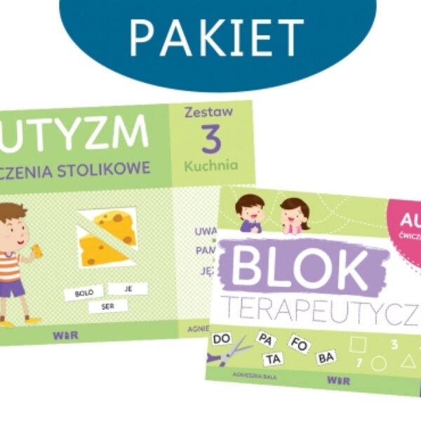 Pakiet zawiera:1. AUTYZM. Ćwiczenia stolikowe. Zestaw 3. KuchniaZestaw Autyzm. Ćwiczenia stolikowe został zaprojektowany tak, by łączyć pracę terapeuty i zaangażowanie rodziców. Podczas zajęć z terapeutą dziecko nabywa umiejętności, które potem doskonali i utrwala podczas zabawy i codziennej interakcji z rodzicami w domu. Zintegrowane, spójne działanie przynosi najlepsze efekty i pozwala cieszyć się postępami dziecka.Materiał zawarty w teczce charakteryzuje:duży format,spokojna tonacja kolorów,czytelne ilustracje.Dla kogo?Dla dzieci z zaburzeniami ze spektrum autyzmu.Dla dzieci zagrożonych autyzmem.Dla dzieci ze specjalnymi potrzebami edukacyjnymi.Narzędzia metodyczne w zestawie 3:dziennik wydarzeń – pomaga w budowaniu kompetencji komunikacyjnej i językowej,zadania z sylabami – pierwszy zestaw zawierał samogłoski; w drugiej części stopniowo przechodzimy do sylab otwartych.Zawartość zestawu:60 kart ćwiczeń,350 grubych, kartonowych elementów:a) układanki,b) obrazki,c) etykiety,instrukcja do ćwiczeń.Liczba stron: 60 kart ćwiczeń + 350 grubych, kartonowych elementówFormat: 27 x 33,5 cmRok wydania: 2021Oprawa: pudełko2. Blok terapeutyczny. AUTYZM. Ćwiczenia stolikoweBlok terapeutyczny dla dzieci z autyzmem oraz tych, które wymagają wsparcia w rozwijaniu umiejętności poznawczych i językowych.Duży format oraz kolorowe ilustracje zachęcą dzieci do ćwiczeń. Zadania umieszczone na kartach pomogą najmłodszym w zdobywaniu umiejętności z zakresu:czytania i pisania sylab otwartych,łączenia sylab i czytania wyrazów, prostych zdań,rozumienia pytań,prawidłowego chwytu narzędzia pisarskiego,planowania ruchu ręki,analizy i syntezy wzrokowej,analizy i syntezy słuchowej.Blok to praktyczna pomoc zarówno dla nauczycieli chcących dostarczyć dziecku dodatkowych bodźców do rozwijania umiejętności, jak i dla rodziców, którzy angażują się w utrwalanie pracy terapeutycznej w domu.Blok terapeutyczny można wykorzystywać w pracy na dwa sposoby:równolegle z zestawem Autyzm. Ćwiczenia stolikowe. Część 3, jako jego uzupełnienie,niezależnie od zestawu, jako materiał do opracowania sylab, liczb, figur geometrycznych oraz wsparcia rozwoju funkcji poznawczych i językowych.Format: 33 x 24 cmRok wydania: 2021