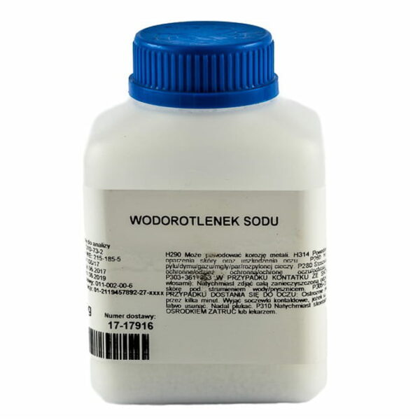 Wodorotlenek sodu cz.d.a 500 g Stanlab Wodorotlenek sodu Synonimy: soda żrąca, soda kaustyczna Wzór chemiczny: NaOH M = 40,00 g/mol CAS: 1310-73-2 WE: 215-185-5 Zawartość: min. 98,8% Gatunek: czysty do analizy Opakowanie: 500 g Zastosowanie: - do użytku laboratoryjnego, - produkcja detergentów, barwników, - główny składnik preparatów do udrażniania rur kanalizacyjnych, - produkcja sztucznego jedwabiu, - produkcja gumy, regeneracji kauczuku, - procesy uzdatniania wody dla celów przemysłowych, - rafinacja ropy i olejów mineralnych, - przeróbka ciekłych produktów koksowania, - przemysł papierniczy.