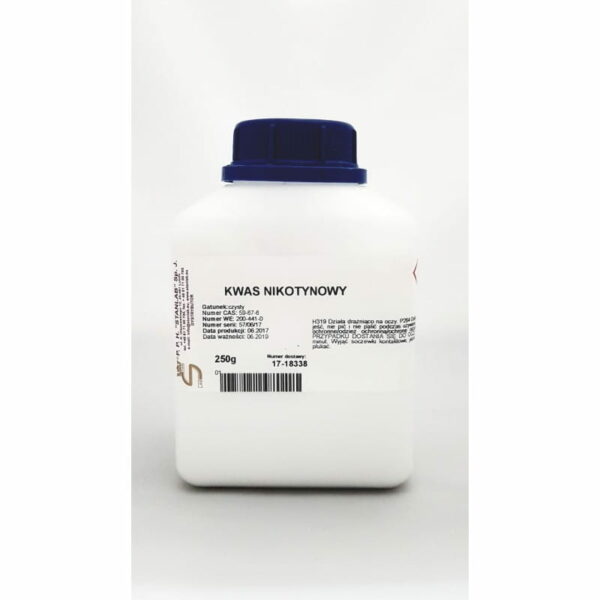 Kwas nikotynowy firmy Stanlab to surowiec laboratoryjny. Poniżej informacje ogólne na temat Kwasu nikotynowego Niacyna , znana również jako kwas nikotynowy , jest związkiem organicznym i formą witaminy B3. Kwas nikotynowy to inaczej witamina PP. Występuje zarówno w produktach pochodzenia zwierzęcego, jak i roślinnego. Jest jedną z najbardziej trwałych witamin, wykazuje małą wrażliwość jeżeli chodzi o zmiany temperatury, światło czy dostęp tlenu. Nazwa związku - witamina PP - wzięła się od tego, iż jest tak zwanym czynnikiem przeciwpelagrycznym (pelagra to choroba spowodowana niedoborem witaminy PP, objawiająca się charakterystycznym rumieniem na skórze, zaburzeniem pracy układu pokarmowego,osłabieniem, niekiedy agresją). Kwas nikotynowy - Właściwości kosmetyczne Witamina B3 (niacyna) korzystnie działa na skórę : Nawilża, działa przeciwutleniająco, zwalcza trądzik i inne problemy skórne. Zmniejsza utratę wody przez skórę, Reguluje procesy odnowy naskórka, Stymuluje produkcję kolagenu w fibroblastach (komórkach skóry). Jest też silnym przeciwutleniaczem, hamuje powstawanie wolnych rodników, chroni skórę przed promieniowania UV, główną przyczyną jej starzenia się, zmniejsza przy tym przebarwienia i zapobiega powstawaniu nowych. Dzięki niej skóra staje się gładsza, zdrowsza, młodsza. Informacje na temat podstawowych właściwości fizycznych i chemicznych kwasu nikotynowego Postać: ciało stałe Barwa: biała do jasnożółtej Zapach: bez zapachu pH (20°C, 50 g/lH2O): 3-4 Temperatura topnienia: 234-237°C Temperatura wrzenia: brak danych T Temperatura zapłonu: 193°C Temperatura samozapłonu: >365°C Granice wybuchowości: brak danych Prężność par: brak danych Gęstość (20°C): 1,47 g/cm3 Gęstość nasypowa: ok. 330 kg/m3 Rozpuszczalność w wodzie: 18 g/l (20°C) Rozpuszczalność w rozpuszczalnikach organicznych: etanol - 10 g/l (20°C) log P(o/w): -2,43
