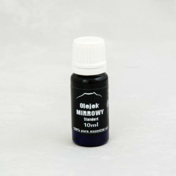 Olejek mirrowy standard 100% czysty olej eteryczny Do użytku zewnętrznego. Mirra to czerwonawa żywica. Olejek eteryczny wytwarzany jest z zastygłej żywicy drzewa mirra (Commiphora myrrha), niskiego krzewu lub drzewa pochodzącego z Etiopii i Somalii. W miejscach nacięć lub uszkodzeń wypływająca z drzewa żywica w zetknięciu z powietrzem twardnieje, tworząc grudki. Kora „płacze” łzami w postaci oleożywicy, która zastyga. Rdzenni zbieracze robią nacięcia na drzewach w celu zwiększenia plonów. Ma ciepły, bogaty, korzenno-balsamiczny zapach. W niższej temperaturze może tężeć, dlatego aby go przywrócić do stanu bardziej płynnego można buteleczkę włożyć do gorącej wody. Oprócz składników zapachowych olejek charakteryzuje się dużą zawartością naturalnych flawonoidów, związków roślinnych o niezwykle wszechstronnej aktywności biologicznej. Pomagają one w redukcji stanów zapalnych i wzmacniają system odpornościowy. Olejek z mirry ma wyjątkowo skuteczne działanie antyseptyczne. Ponadto ma właściwości tonizujące, stymulujące, uzdrowieńcze, przeciwzapalne i przeciwbólowe. Bardzo skuteczny w ból gardła i w leczeniu chorób jamy ustnej (zapalenie dziąseł, zapalenie jamy ustnej, stany zapalne spowodowane protezami, itp.). Jest również skutecznym środkiem w zakażeniach dróg oddechowych. Właściwości : Oczyszczające (usta i gardło) Łagodzące skórę Przywraca młody wygląd skóry Poprawia samopoczucieZastosowanie :Olejek z mirry zaleca się stosować zewnętrznie miejscowo na skórę w miejscach wymagających ingerencji. Stosowany jest również w olejkach do masażu. Przy przeziębieniu i zapaleniu górnych dróg oddechowych rozcieńczony może być używany do nacierania klatki piersiowej i pleców. W przypadku stanów zapalnych jamy ustnej, dziąseł i zapalenia gardła polecane jest płukanie jamy ustnej (1 – 3 krople na pół szklanki ciepłej wody). Do kominka w aromatoterapii.Konsystencja olejku jest dość gęsta, zaleca się umieszczenie buteleczki w bardzo gorącej wodzie, aż do powrotu do stanu ciekłego, następnie należy wstrząsnąć.Uwaga :Może być toksyczny w dużych stężeniach, nie powinien być używany podczas ciąży.