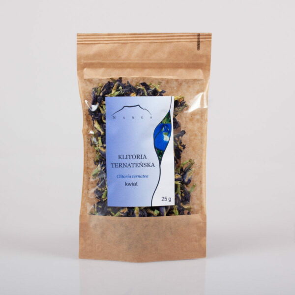 Klitoria ternateńska (Clitoria ternatea) – tropikalna roślina z rodziny bobowatych, wytwarzająca niebieskie kwiaty o kształcie zdumiewająco podobnym do kobiecej łechtaczki (z łac. clitoris) – skąd pochodzi jej nazwa rodzajowa Clitoria. Jej rodzimym obszarem występowania jest Afryka, ale obecnie rośnie także w cieplejszych rejonach Azji, Ameryki Środkowej oraz Ameryki Południowej. Cenionym surowcem są kwiaty posiadające w swoim składzie duże ilości antocyjanów – silnych antyoksydantów, które nadają roślinie intensywną, niebieską barwę. Obok nich obecne są także flawonoidy, laktony, fitosterole oraz terpenoidy. Od niepamiętnych czasów klitoria stosowana była we wschodniej medycynie tradycyjnej jako środek zwiększający możliwości intelektualne, wzmacniający pamięć i koncentrację. Napary z jej kwiatów spożywano dla wzmocnienia i poprawy wzroku oraz stosowano je do pielęgnacji skóry i włosów. W krajach azjatyckich klitoria od dawna znajduje zastosowanie również w kuchni – jako niebieski barwnik do deserów, ryżu lub ciasta. Właściwości prozdrowotne Wspiera pracę układu nerwowego – pozytywnie wpływa na pamięć, koncentrację, poprawia samopoczucie, redukuje stres. Wspomaga prawidłowe funkcjonowanie narządu wzroku. Korzystnie wpływa na kondycję skóry i włosów. Klitoria ternateńska kwiat w formie całej lub mielonej. Produkt najwyższej jakości! Kraj pochodzenia: Chiny 2. Składniki Kwiat klitorii 100%. 3. Zalecany sposób użycia KWIAT CAŁY Napar 5-6 kwiatów zalać szklanką wrzącej wody. Przykryć i odstawić na 10-15 minut. Kwiaty klitorii można połączyć z ulubioną herbatą, trawą cytrynową, miodem i sokiem z cytryny. Po zakwaszeniu naparu uzyskamy barwę purpurową. KWIAT MIELONY Zmielone kwiaty zażywać 3 razy dziennie po 3-5g, popijając ciepłym płynem. Proszek można wymieszać z miodem. 4. Sposób przechowywania Przechowywać w miejscu niedostępnym dla dzieci! Przechowywać w suchym i chłodnym miejscu. Chronić przed bezpośrednim światłem słonecznym. 5. Przeciwwskazania Nie należy stosować w okresie ciąży i laktacji.