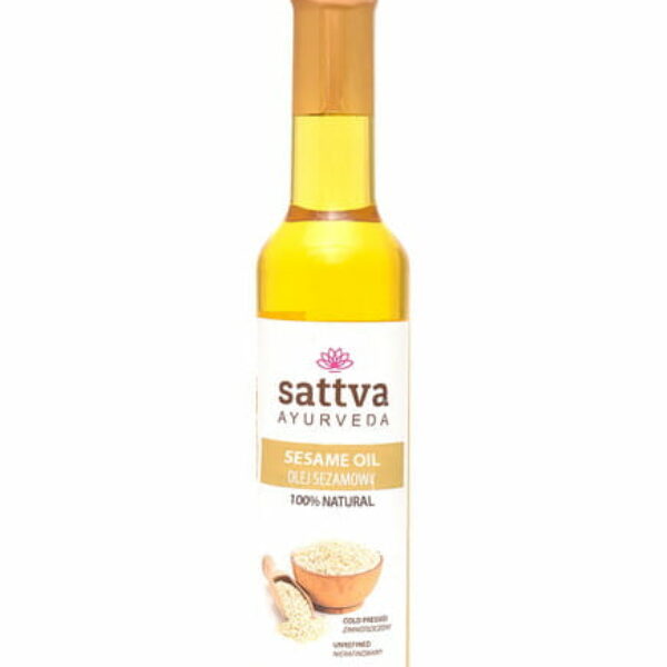 SATTVA OIL SESAME 500 ML Sattva olej sezamowy 500ml Nierafinowany olej sezamowy pozyskiwany jest ze starannie wyselekcjonowanych nasion sezamu, które są tłoczone na zimno. Zastosowanie: - w kuchni: popularny element kuchni azjatyckiej - głównie do gotowania,sałatek i sosów. Na oleju sezamowym nierafinowanym nie należy podgrzewaćani smażyć potraw.- w kosmetyce: używany do pielęgnacji włosów i skóry głowy, jako olejek do ciała, masażu oraz kąpieli. Przechowywać w suchym i chłodnym miejscu z dala od promieni słonecznych. Skład: Sesamum Indicum Seed Oil Wyprodukowano w Indiach