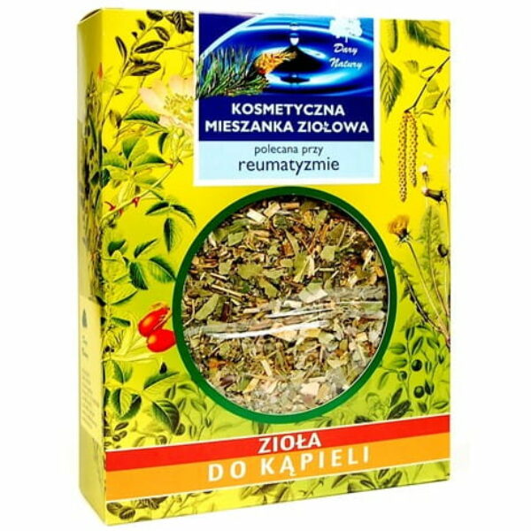 ZIOŁA DO KĄPIELI PRZY REUMATYZMIE 200 g - DARY NATURY Mieszanka ziołowa do kąpieli. Kąpiel w ziołach działa łagodząco przy dolegliwościach związanych z reumatyzmem, przynosi uczucie odprężenia i zrelaksowania. Składniki: pączki i igliwie sosny, ziele wiązówki, liść brzozy, kora wierzby, ziele nawłoci, liść maliny, ziele bylicy. Sposób użycia: Wziąć 3 - 5 łyżek ziół, wsypać do naczynia z 2 - 3 litrami wrzątku, gotować na wolnym ogniu ok. 5 minut. Odwar wlać do wanny wypełnionej wodą. Czas trwania kąpieli ok. 20 minut. Stosować 2 - 3 razy w tygodniu. Zalecane warunki przechowywania: