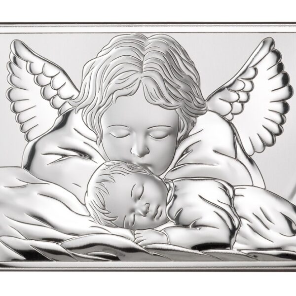 Obrazek Aniołek nad dzieckiem 81288/4XL Wymiary obrazka: 20 x 12cm Obrazek srebrny z przepięknym Aniołkiem całującym główkę małego dziecka. W produkcji obrazka wykorzystano innowacyjny metal szlachetny , który został pokryty warstwą czystego srebra o próbie 999,95 Drogocenny metal przewyższa jakością materiały pozyskiwane metodami tradycyjnymi. Jest odporniejszy na uszkodzenia mechaniczne i śniedzenie, doskonale odbija światło, co podkreśla szlachetność srebra. Całość została wyprodukowana we Włoszech, zgodnie tradycją obróbki metali szlachetnych. Do obrazka dołączona jest nóżka, aby móc postawić obrazek oraz otwór do powieszenia. Doskonały prezent na Chrzest Święty, lub narodziny dziecka. Obrazek srebrny zapakowany w eleganckie pudełko.