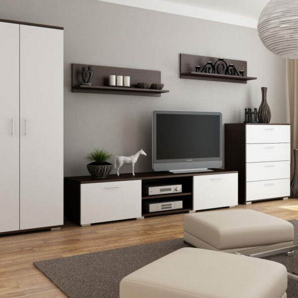 Poznaj naszą reprezentacyjną meblościankę Carles, która będzie doskonałym uzupełnieniem nowoczesnego i przestronnego wnętrza. Jest to starannie skomponowany zestaw mebli, doskonały nawet dla najbardziej wymagających klientów. Wszystkie meble w zestawie tworzą harmonijną całość, dzięki dokładnemu wykończeniu wszystkich detali. Na naszej szafce RTV bez problemu wyeksponujesz nawet bardzo dużych rozmiarów telewizor. Dodatkowo pomieścisz i wyeksponujesz wszystkie niezbędne sprzęty a w dodatkowych półkach także drobiazgi niezbędne w salonie. Nasza meblościanka Carles z pewnością ozdobi każdy nowoczesny i elegancki salon, będąc jednocześnie bardzo praktycznym zestawem mebli. Pojemna szafa z drążkiem na całej długości oraz dodatkową półką na poskładane ubrania, przyda się w niejednym rodzinnym domu. Elegancka komoda z szufladami, tak modna w ostatnim czasie również poza walorami estetycznymi i designem, pomoże Ci uporządkować garderobę lub inne niezbędne drobiazgi, które pojawiają się w życiu codziennym. W skład meblościanki Carles wchodzi: szafa, szafka rtv, komoda oraz 2 półki wiszące. Wszystkie szafki zostały wykonane z płyty laminowanej o grubości 18 mm, ścianą tylną zestawu jest płyta HDF. Jest to produkt polski, wykonany z dbałością o każdy szczegół, dlatego też posłuży Ci przez długie lata. Kolor WENGE/BIAŁY WYMIARY Szafka RTV: wysokość – 35 cm głębokość – 40 cm szerokość – 150 cm Komoda: wysokość – 100 cm głębokość – 40 cm szerokość – 80 cm Półka wisząca x 2: wysokość – 20 cm głębokość – 20 cm szerokość – 100 cm Szafa: wysokość – 190 cm głębokość – 50 cm szerokość – 80 cm Do kompletu dołączona jest czytelna instrukcja obsługi. Meble dostarczane są w paczkach do samodzielnego montażu razem z kompletem akcesoriów meblowych.
