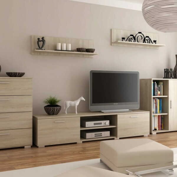 Poznaj naszą nowoczesną meblościankę Silia, która będzie doskonałym uzupełnieniem designerskiego i przestronnego wnętrza. Jest to starannie skomponowany zestaw mebli, doskonały nawet dla najbardziej wymagających klientów. Wszystkie meble w zestawie tworzą harmonijną całość, dzięki dokładnemu wykończeniu wszystkich detali. Na naszej szafce RTV bez problemu wyeksponujesz nawet bardzo dużych rozmiarów telewizor. Dodatkowo pomieścisz i wyeksponujesz wszystkie podstawowe sprzęty a w dodatkowych półkach także drobiazgi niezbędne w salonie. Nasz minimalistyczny zestaw mebli Silia z pewnością ozdobi każdy nowoczesny i elegancki salon, będąc jednocześnie bardzo praktycznym zestawem mebli. Pojemna komoda z drzwiczkami oraz dodatkowymi półkami na poskładane ubrania, dekoracje lub książki przydadzą się w niejednym rodzinnym domu. Komoda z szufladami pozwoli ukryć to, co nie koniecznie musi być w zasięgu wzroku Twoich gości. Eleganckie półki wiszące, tak modne w ostatnim czasie również poza walorami estetycznymi i designem, pomogą Ci uporządkować książki, dodatki lub inne niezbędne drobiazgi, które pojawiają się w życiu codziennym. W skład meblościanki Silia wchodzi: szafka rtv, 2 komody oraz 2 półki wiszące. Wszystkie szafki zostały wykonane z płyty laminowanej o grubości 18 mm, ścianą tylną zestawu jest płyta HDF. Jest to produkt polski, wykonany z dbałością o każdy szczegół, dlatego też posłuży Ci przez długie lata. Kolor DĄB SONOMA Wymiary: Szafka RTV: wysokość – 35 cm głębokość – 40 cm szerokość – 150 cm Komoda z szufladami: wysokość – 100 cm głębokość – 40 cm szerokość – 80 cm Komoda z drzwiczkami: wysokość – 100 cm głębokość – 30 cm szerokość – 80 cm Półka wisząca x 2: wysokość – 20 cm głębokość – 20 cm szerokość – 100 cm Informacje dodatkowe: - Mebel wykonany z wysokiej jakości płyty laminowanej o grubości 18 mm.- Nowoczesna stylistyka. - Meble w paczce do samodzielnego montażu. Do mebli dołączona jest instrukcja montażu.- Okres gwarancji producenta: 2 lata