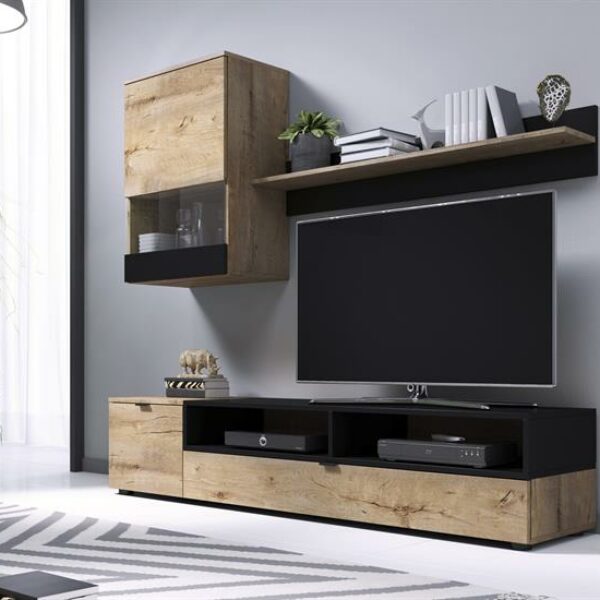 Zestaw mebli Off Jak łatwo zaaranżować salon w mieszkaniu lub kącik telewizyjny? Otóż sprawdzi się zestaw mebli w jednym zdefiniowanym nurcie, który nada takiemu miejscu właściwego tonu, perfekcyjnie wpisanego w gust domowników! Zestaw mebli Off składa się z kombinacji modułowych elementów, które mogą funkcjonować razem, jako meblościanka, a także oddzielnie np. w różnych miejscach klimatycznie urządzonego salonu. Jest to szafka RTV typu long (aż 175 cm długości!) z miejscem na telewizor, może ona tworzyć centralny punkt aranżacji. Uzupełni taką przestrzeń przeszklona witryna wisząca (gablota), a także półka ścienna, stanowiąca przysłowiową "kropkę nad i" tego kompletu! Zestaw mebli Off - polski design w świetnej cenie! Meblościanka Off to polski produkt, wykonany z wytrzymałej płyty meblowej laminowanej. Materiał ten jest niezwykle solidny, odporny na zadrapania i uderzenia. W dodatku prezentuje się bardzo modnie, a to za sprawą wybarwienia i pomysłowych wstawek. Kolor mebli "dąb lefkas" imitujący drewno, w połączeniu z czarnym matem oraz z przeszkleniem ze szkła hartowanego transparentnego - tworzą razem naprawdę nieszablonową kompozycję. Tekstury świetnie się tu przenikają i zachwycają wyglądem. Zestaw ten pięknie będzie się więc prezentować we wnętrzach industrialnych i rustykalnych. Również w pomieszczeniach, w których założeniem wnętrzarskim ma być wyrafinowany styl i klasa! A przy tym - jest praktyczny. Komplet mebli do salonu Off to bowiem nie tylko designerskie elementy wyposażenia! Szafka pod telewizor pozwoli na ustawienie sprzętów, będących częściami kina domowego. Szafki z uchwytami to dodatkowe miejsce na przechowywanie, zaś przeszklona gablota i półka pozwolą na wyeksponowanie eleganckiego szkła, pamiątek, ramek ze zdjęciami i innych przedmiotów o wartości sentymentalnej. Stwórz swój własny zestaw z innymi meblami w kolorze dąb lefkas! Opis produktów: Szerokość zestawu - 175 cm, wysokość zestawu - 180 cm, głębokość mebli - 39 cm, waga - 52 kg Wymiary półki: 120 cm x 19 cm, 5 cm x 21 cm Rozmiary witryny: 55 cm x 78 cm x 33,4 cm Wymiary szafki RTV: 175 cm x 45 cm x 39 cm Materiał: meblowa płyta okleinowana, szkło, Kolor: konstrukcja - dąb lefkas, czarny mat, szkło hartowane/ transparentne, nogi plastikowe - czarne, uchwyty - czarne Przeznaczenie: salon, pokój dzienny, kącik telewizyjny Styl: rustykalny, industrialny, nowoczesny Meble przeznaczone do samodzielnego montażu