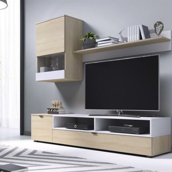 Meblościanka z szafką RTV, półką i witryną dąb sonoma/biały