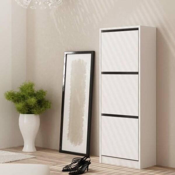 Biała wąska szafka na buty, wysoka komoda 136x49 cm
