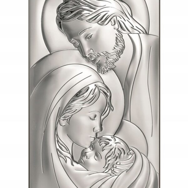 Obrazek srebrny Św. Rodzina Wymiary obrazka: 12 x 24 cm. Obrazek przedstawia Św. Rodzinę. Jest podłużny, dlatego pięknie będzie wyglądał wisząc na ścianie. W jego produkcji wykorzystano innowacyjny metal szlachetny, który został pokryty warstwą czystego srebra o próbie 999,95 Drogocenny metal przewyższa jakością materiały pozyskiwane metodami tradycyjnymi. Jest odporniejszy na uszkodzenia mechaniczne i śniedzenie, doskonale odbija światło, co podkreśla szlachetność srebra. Całość została wyprodukowana we Włoszech, zgodnie tradycją obróbki metali szlachetnych. Do obrazka dołączona jest nóżka, aby móc go postawić oraz otwór do powieszenia. Będzie wspaniałym prezentem na różne okazje ( Ślub, Rocznicę Ślubu itp.)