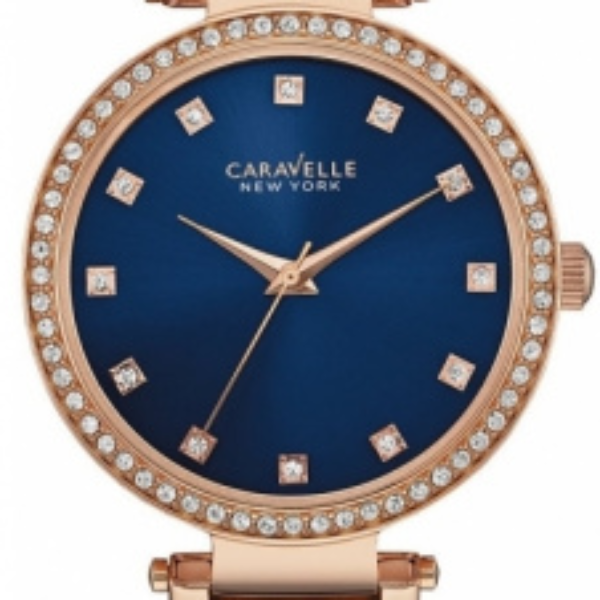 ZEGAREK CARAVELLE 44L210 Zegarek damski marki Caravelle od Bulova. To pierwsze czasomierze fashion, które powstały w duchu tętniącego życiem Nowego Jorku . Koperta i bransoleta została wykonana z wysokiej jakości stali w kolorze różowego złota. Koperta odporna na ścieranie oraz na działanie warunków atmosferycznych. Piękna granatowa tarcza zegarka sprawia że zegarek jest bardziej wyrazisty. Tarczę ozdobiono kryształami, które efektownie zdobią czasomierz. Mechanizm kwarcowy na baterię. Wodoszczelność to 30M,odporny jedynie na zachlapania. Stylowy, piękny zegarek dla każdej kobiety .
