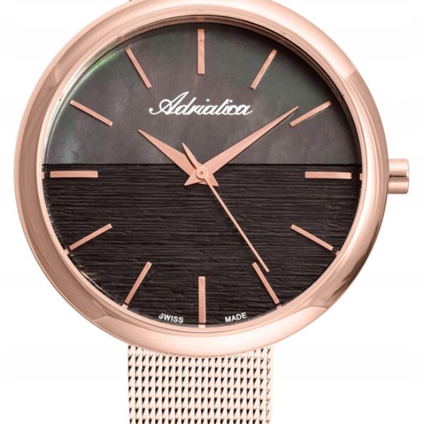 Zegarek Adriatica A3525.9114Q Zegarek damski, klasyczny i elegancki. Najwyższa jakość wykonania. Koperta wykonana z wysokiej jakości stali szlachetnej, która jest odporna na korozję oraz nie uczula. Wodoszczelność typu 30 WR zabezpiecza w przypadku niespodziewanego zachlapania. Mechanizm zegarka jest szwajcarski, kwarcowy zasilany baterią. Oprócz wysokiej jakości zegarek został zaprojektowany w najnowocześniejszym stylu. Bardzo modna i delikatna bransoletka typu mesh w połączeniu z niespotykanym cyferblatem sprawia, że ten czasomierz naprawdę robi wrażenie. Szczegóły zegarka: Mechanizm : szwajcarski mechanizm kwarcowy( ronda 763), który zasila bateria Szkło: mineralne Szerokość koperty: 37 mm. Grubość koperty: 8 mm. Koperta: wykonana ze stali nierdzewnej, nie uczula Bransoletka: stal szlachetna, kolor różowe złoto Maksymalny obwód bransoletki: 18 cm Szerokość bransoletki: 14mm Wodoszczelność: 30 m Gwarancja: 2 lata