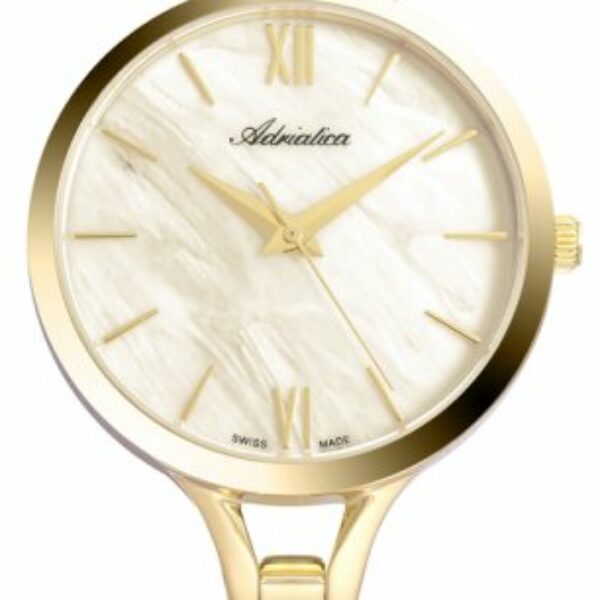 Zegarek Adriatica A3739.116SQ Zegarek damski, klasyczny i elegancki. Najwyższa jakość wykonania. Koperta wykonana z wysokiej jakości stali szlachetnej, która jest odporna na korozję oraz nie uczula. Wodoszczelność typu 30 WR zabezpiecza w przypadku niespodziewanego zachlapania. Mechanizm zegarka jest szwajcarski, kwarcowy zasilany baterią. Oprócz wysokiej jakości ten model został zaprojektowany w najnowocześniejszym stylu. Bransoletka jak i koperta są zachowane w klasycznym stylu, natomiast pięknym dodatkiem jest cyferblat wykonany z masy perłowej, która mieni się różnymi kolorami, w zależności od kąta padania światła. Szczegóły zegarka: Mechanizm : szwajcarski mechanizm kwarcowy, który zasila bateria( ETA 902 ) Szkło: mineralne Szerokość koperty: 30mm. Grubość koperty: 8 mm. Koperta: wykonana ze stali nierdzewnej, nie uczula,kolor żółte złoto Bransoletka : stal szlachetna, kolor żółte złoto, z regulacja Cyferblat: masa perłowa Maksymalny obwód bransoletki: 18 cm Szerokość bransoletki: 8 mm Wodoszczelność: 30 m Gwarancja: 2 lata