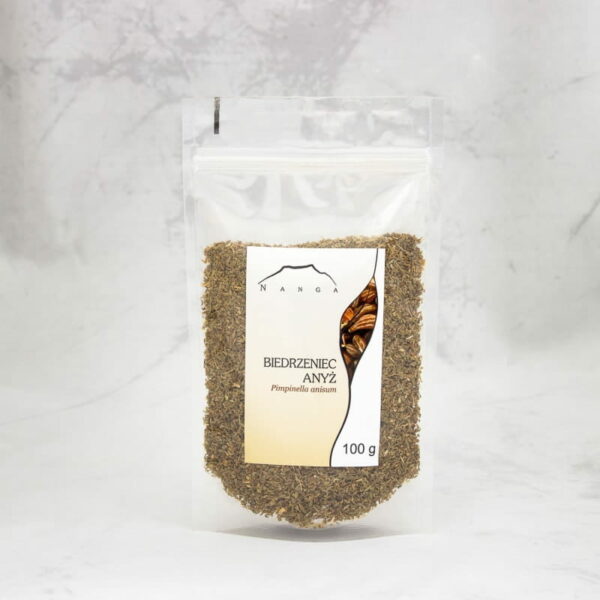 Biedrzeniec anyż 100g MagicznyOgród Pimpinella anisum Biedrzeniec anyż (Pimpinella anisum) gatunek jednorocznej rośliny z rodziny selerowatych. Prawdopodobnie pochodzi ze wschodnich obszarów basenu Morza Śródziemnego. Surowcem oficjalnym jest owoc – Fructus Anisi. Rozłupnia do 5mm długości, o gruszkowatym kształcie, rozpadająca się na dwie rozłupki o zielonkawoszarym kolorze i szorstkiej fakturze. DZIAŁANIE Wiatropędne Pobudza laktację DAWKOWANIE Napar – Infusum Anisi 1 łyżkę rozdrobnionych nasion zalać 1 szklanką wrzącego mleka lub wody; przykryć, odstawić na 20-30 minut, przecedzić, osłodzić do smaku syropem lub miodem. Pić 3 razy dziennie po 100ml; w nieżycie układu oddechowego, przy kaszlu 100 ml 4 razy dziennie. Nalewka – Tinctura Anisi 1 część rozdrobnionych owoców na 3-5 cz. alkoholu 40-70%, wytrawiać 2-3 tygodnie, przecedzić. Zażywać 3-4 razy dziennie po 5ml w mleku, na miodzie lub osłodzonej wodzie. SKŁAD Owoce zawierają od 1,5 do 3% olejku eterycznego, ok. 18% białek, ok. 50% cukrów i 16% tłuszczów. Głównym składnikiem olejku eterycznego jest trans-anetol (ok. 80-85%), ponadto zawiera cis-anetol, dianetol, estragol (metylochawikol), p-,etoksyfenyloaceton, beta-kariofilen, kwas anyżowy, aldehyd anyżowy. W owocach są obecne kumaryny (umbeliferon, skopoletyna), kwasy fenolowe (kwas chlorogenowy, kwas chinowy), beta-amyryna, stigmastrerol, glikozydy flawonoidowe (kwercetyna, rutyna, luteolina, izo-orientyna, izowiteksyna, apigenina). PRZECIWWSKAZANIA Niedrożność dróg żółciowych, w kamicy żółciowej stosować po konsultacji z lekarzem. Przy dłuższym stosowaniu mogą wystąpić dolegliwości żołądkowe. Współcześnie biedrzeniec anyż występuje wyłącznie w uprawie, nie jest zbierany ze stanowisk naturalnych. W Polsce jest rzadko uprawiany, czasami przejściowo dziczejący (efemerofit).