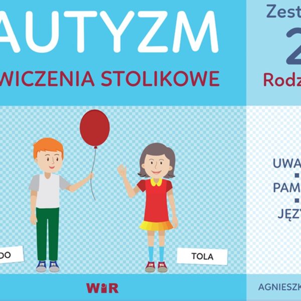 AUTYZM. Ćwiczenia stolikowe. Zestaw 2. Rodzina, Agnieszka Bala, Wydawnictwo WIR.Zestaw został zaprojektowany tak, by łączyć pracę terapeuty i zaangażowanie rodziców. Podczas zajęć z terapeutą dziecko nabywa umiejętności, które potem doskonali i utrwala podczas zabawy i codziennej interakcji z rodzicami w domu. Zintegrowane, spójne działanie przynosi najlepsze efekty i pozwala cieszyć się postępami dziecka.Materiał zawarty w teczce charakteryzuje:- duży format,- spokojna tonacja kolorów,- czytelne ilustracje.Dla kogo?- dla dzieci z zaburzeniami ze spektrum autyzmu,- dla dzieci zagrożonych autyzmem,- dla dzieci ze specjalnymi potrzebami edukacyjnymi.Nowe narzędzia metodyczne w zestawie 2:- dziennik wydarzeń - pomaga w budowaniu kompetencji komunikacyjnej i językowej, - zadania z sylabami - pierwszy zestaw zawierał samogłoski; w drugiej części stopniowo przechodzimy do sylab otwartych.Zawartość zestawu:- 60 kart ćwiczeń,- 350 grubych, kartonowych elementów a) układanki, b) obrazki, c) etykiety,- instrukcja do ćwiczeń