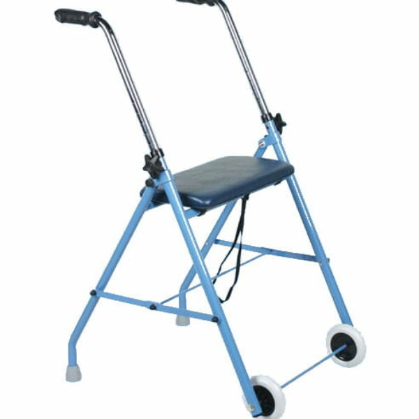 Podpórka rehabilitacyjna dwukołowa Model AR-020 Podpórka jest sprzętem pomocniczo-rehabilitacyjnym przeznaczonym dla osób niepełnosprawnych ze schorzeniem narządu ruchu, z problemami pionizacji lub mających problem z utrzymaniem równowagi w czasie chodzenia. Wykorzystywana jest również dla utrzymania równowagi w czasie nauki chodzenia po przebytej chorobie lub urazie. Używana często przez osoby starsze, niepełnosprawne oraz osoby z problemami narządu ruchu. Ogromną zaletą tej podpórki jest jej niewielka waga oraz minimalne wymiary po złożeniu, co znacznie ułatwia przechowywanie. Dzięki wyposażeniu w siedzisko zapewnia zwiększenie komfortu użytkownikowi – możliwość odpoczynku podczas długich spacerów. Informacje o produkcie: rama stalowa, składana - lakierowana metodą proszkową stabilna i wytrzymała konstrukcja z regulacją wysokości rączek (co 2,5cm) wyprofilowane uchwyty 2 koła bezobsługowe, pełne – 10 cm 2 nogi ze stopkami antypoślizgowymi siedzisko miękkie, pokryte PVC Parametry techniczne: Wymiary siedziska: 42 x 21cm Wysokość do siedziska: 52cm Szerokość wewnętrzna pomiędzy rurkami: 43,5cm Wysokość rączek: 75,5-92cm (co 2,5cm) Szerokość całkowita: 49cm Długość całkowita: 63cm Szerokość (grubość po złożeniu): 18cm Waga: 4,5 kg Maksymalne obciążenie: 136kg Dostępny kolor: Niebieski