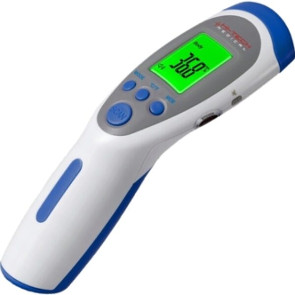 Termometr bezdotykowy wielofunkcyjny ORO-T70 PERFECT Termometr HI-TECH MEDICAL ORO-T70 PERFECT na podczerwień służy do pomiaru temperatury ciała lub wybranej powierzchni przy użyciu promieniowania pod-czerwonego. Termometr jest bezinwazyjny, bezkontaktowy, łatwiejszy i wygodniejszy w użyciu niż tradycyjne termometry wymagające bezpośredniego kontaktu ze skórą. Dzięki ORO-T70 PERFECT nie ma potrzeby kontaktu termometru z jakąkolwiek częścią ciała Twojego dziecka. Śpiące niemowlę nie obudzi się podczas kiedy termometr będzie w użyciu ani nie odczuje jego użycia kiedy nie śpi. Termometr bezdotykowy HI-TECH MEDICAL ORO-T70 PERFECT ma funkcję trójkolorowej identyfikacji poziomu temperatury: -gdy temperatura jest niższa od 37,3°C, zapali się wyświetlacz zielony, -gdy temperatura jest równa lub wyższa niż 37,4°C zapali się wyświetlacz pomarańczowy, -gdy temperatura jest równa lub wyższa niż 38,0°C, zapali się czerwona dioda Podstawowe cechy termometru bezdotykowego HI-TECH MEDICAL ORO-T70 PERFECT: Termometr działa na zasadzie procesu dynamicznej korekcji uwzględniającej temperaturę otoczenia względem temperatury ciała lub powierzchni wybranego przedmiotu. Termometr służy do pomiaru temperatury na czole, temperatury otoczenia i przedmiotów. Wybór trybu pomiaru temperatury na czole lub powierzchni przedmiotów o temperaturze niższej niż 60°C i emisyjności równej 0,95. Pomiary przeprowadzane są wyłącznie przy użyciu sondy na podczerwień o wysokim stopniu dokładności pomiaru i stabilnym działaniu. Funkcja alarmu w przypadku podwyższonej temperatury ciała. Funkcja pamięci 32 ostatnich wyników. Podświetlany wyświetlacz cyfrowy LCD. Dwa tryby pomiaru temperatury: skala Fahrenheita i Celsjusza, do wyboru. Tryb automatycznego oszczędzania energii; termometr wyłącza się, jeśli nie jest używany- po 30s. Niewielki rozmiar, przemyślana konstrukcja i wygodna obsługa, nowoczesny wygląd Wybór trybu pomiaru temperatury na czole lub powierzchni przedmiotów o temperaturze niższej niż 60°C i emisyjności równej 0,95. Identyfikacja poziomu temperatury: 3 kolory Higieniczny i oszczędny - HI-TECH MEDICAL ORO-T70 PERFECT eliminuje koszty związane z wymianą jedno-razowych kapturków lub przeprowadzania procesu dezynfekcji jednocześnie eliminując możliwość przenoszenia drobnoustrojów. Dzięki bezdotykowemu pomiarowi, bardzo łatwo i bezinwazyjnie wykonujemy pomiary temperatury u dzieci. HI-TECH MEDICAL ORO-T70 PERFECT to nowoczesny termometr, w którym zastosowano technologię pomiaru na podczerwień. Termometr jest bardzo dokładny co zostało potwierdzone badaniami klinicznymi. Pomiar trwa tylko 0,5 sekundy, dzięki czemu pomiaru można dokonać nawet u bardzo ruchliwych dzieci, w każdych warunkach (dom, praca, podróż). Duży, dobrze zaprojektowany wyświetlacz LCD umożliwia łatwy odczyt wyniku. Dzięki podświetlanemu ekranowi możemy odczytywać wyniki w nocy. Dzięki temu termometrowi również szybko wykonamy pomiary temperatury otoczenia, żywności, napojów i kąpieli dla dziecka. SPECYFIKACACJA TECHNICZNA: Zakres temperatury: - Zakres pomiaru: temperatura ciała: 32°C – 42,9°C / 89,6°F – 109,2°F.- Zakres pomiaru: temperatura powierzchni: 0,0°C – 60,0°C / 32,0°F – 140,0°F. Błąd pomiaru: w standardowych warunkach otoczenia: +/-0,2°C/0,3°C. Odległość od miejsca dokonywania pomiaru na czole: 3cm – 5cm. Odległość do miejsca dokonywania pomiaru temperatury wybranej powierzchni: 3cm – 6cm (w miarę odsuwania termometru od wybranej powierzchni coraz większy wpływ na podany wynik będzie mieć temperatura otoczenia). Zasilanie: (baterie AA/2 sztuki). Pobór mocy: ≤ 300mW. Podstawowe wymiary: 175mm × 50mm × 52mm (dł. × szer. × wys.). Masa netto: 148g (bez baterii). Standardowe warunki działania urządzenia:- Temperatura robocza otoczenia: 10°C - 40°C.- Wilgotność względna:≤85%- Emisyjność: 0,95. Termometry są zarejestrowane jako urządzenia medyczne w URZĘDZIE REJESTRACJI PRODUKTÓW LECZNICZYCH, WYROBÓW MEDYCZNYCH I PRODUKTÓW BIOBÓJCZYCH, co gwarantuje wysoką dokładność ich wskazań. SKŁAD ZESTAWU: Termometr 2 baterie AA Instrukcja obsługi w języku polskim Gwarancja polska 24 miesiące