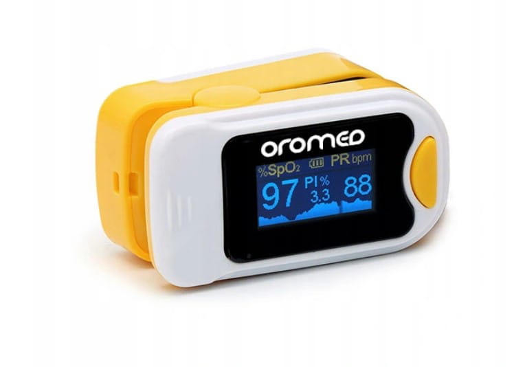 Pulsoksymetr ORO-PULSE Pulsoksymetr Oro-puls to kompaktowe urządzenie służące do pomiaru nasycenia krwi tlenem oraz pulsu. Pulsoksymetr ORO-PULSE przeznaczony zarówno dla pracowników służby zdrowia, pacjentów ale także osób chcących monitorować parametry zdrowia pod względem osiągów sportowych. Łatwa obsługa pozwala na uzyskanie odczytu już w kilka sekund, a kieszonkowe rozmiary pulsoksymetru pozwalają mieć urządzenie zawsze przy sobie. Czytelny wyświetlacz z indeksem perfuzji (PI) WŁAŚCIWOŚCI kieszonkowe wymiary: 60 x 35 x 35 mm; waga: 65g, zintegrowany czujnik i kolorowy wyświetlacz o rozdzielczości 128x 64 piksele wyniki pomiarów saturacji oraz tętna wyświetlane w formie liczbowej oraz graficznej 6 trybów wyświetlania – 4 kierunki, opcja krzywej pletyzmograficznej, pamięć trybu wyświetlania wskaźnik niskiego poziomu baterii automatyczne wyłączanie po wyciągnięciu palca (po 5 sekundach ) SPECYFIKACJA TECHNICZNA Zakres pomiaru saturacji: 70 – 99 %. Zakres pomiaru tętna: 30 – 240 uderzeń na minutę Dokładność pomiaru saturacji: ±2% (w zakresie 70-100%) Zasilanie: 2 baterie AAA (pozwalają na 20-36 godzin aktywnej pracy) PARAMETRY PRODUKTU Zakres pomiaru SpO2 (%) Od: 70 do: 99 Zakres pomiaru częstości rytmu serca (1/min) Od: 30 do: 240 Zasilanie (akumulatorowe/bateryjne) bateryjne
