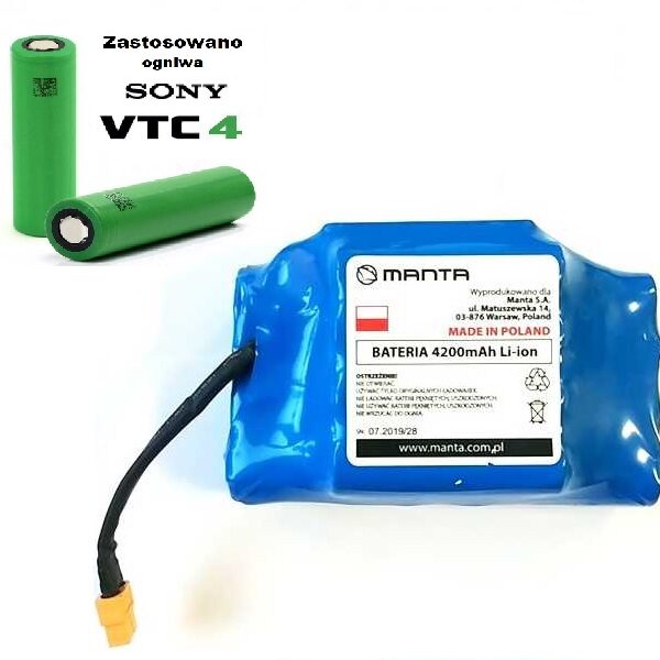 Akumulator wyprodukowany w Polsce na ogniwach firmy SONY.Parametry akumulatora:- Pojemność – 4200mAh- Napięcie - 36V- Rodzaj ogniw - Li-Ion - Ogniwa - SONY- Ilość ogniw - 20szt.- Stan - Fabrycznie nowa- Produkcja - Polska- Gwarancja – 6 miesięcy Wymienny akumulator pasuje do większości desek elektrycznych dzięki zastosowaniu standardowej końcówki do podłączenia z płytą główną.