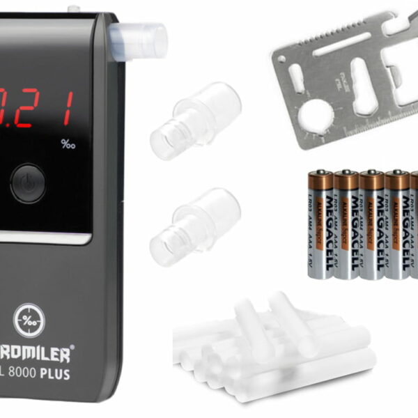 Alkomat Promiler AL 8000 - jeden z najlepszych alkomatów elektrochemicznych na rynku, niezwykle dokładny i niezawodny - aż 5 lat gwarancji! PROMILER AL 8000 PLUS to alkomat najwyższej klasy o czym świadczą liczne nagrody i wyróżnienia m.in. zwycięzca testów Motoru. Urządzenie bazuje na sprawdzonym i uznanym na świecie, platynowym sensorze QMol 2.0. Wersja AL 8000 PLUS w stosunku do modelu AL 8000 została wzbogacona o kilka, ważnych funkcji zwiększających zarówno wiarygodność pomiaru, jak i ogólną użyteczność, a wszystko w sprawdzonej, ergonomicznej i eleganckiej obudowie. Dodatkowe funkcjonalności to pamięć ostatnich 10 pomiarów z wskazaniem czasu badania oraz 2 nowe systemy bezpieczeństwa - ACR i PSD. Nowością w tym alkomacie jest również przyjazna i przejrzysta informacja o zbliżającej się kalibracji np.: "CAL in 28 day or 236 tst". PROMILER AL 8000 PLUS z pewnością spełni wymagania nawet najbardziej wiarygodnych użytkowników indywidualnych. Kup alkomat Promiler - bądź bezpieczny i odpowiedzialny! Alkomat Promiler (dawniej Sentech) AL 8000 PLUS został zaprojektowany przez specjalistów od wzornictwa przemysłowego, jest mały, lekki, designerski. Najnowsza technologia zastosowana w sensorze Quantum Molecule Technology Sensor 2.0 pozwala na niezwykłą dokładność w zakresie do 0.00 do 4.00 ‰, zarezerwowaną do tej pory dla urządzeń policyjnych. Promiler AL 8000 PLUS jako jeden z nielicznych alkomatów spełnia najbardziej restrykcyjną normę europejską EN 16280:2012. Inteligentne oprogramowanie urządzenia samo rozpoznaje, czy alkomat wymaga kalibracji. Kalibrację urządzenia należy wykonać po 12 miesiącach lub po 1000 pomiarów - kupując urządzenie u nas, masz 12 miesięcy darmowych kalibracji bez limitu! To nie wszystko, do Alkomatu dodajemy kupon na darmową wysyłkę - dzięki temu nie ponosisz kosztów wysyłki na pierwszą kalibrację! Każdy alkomat z serii AL 8000 PLUS posiada dedykowane etui z logo Promiler, które oprócz samego urządzenia pomieści zapasowe ustniki - w zestawie znajdują się 2 sztuki ustników. Alkomat posiada również wbudowany, wysuwany ustnik - dlatego jeżeli zapomnimy w podróż zapasowych ustników, nadal możemy korzystać z urządzenia. (W naszej ofercie również dodatkowe ustniki). Tylko nasz sklep dodaje do każdego alkomatu przydatną w każdym samochodzie kartę survivalową gratis oraz 10 słomek ustników gratis. Zestaw zawiera: - Skalibrowany i gotowy do pracy alkomat - Kartonowe, eleganckie opakowanie - Zestaw baterii alkalicznych - Polska instrukcja - Ustniki wielorazowego użytku 2 szt. - Etui z logotypem Promiler - 10 jednorazowych słomek do ustników - karta survivalowa - komplet 6 dodatkowych baterii AAA